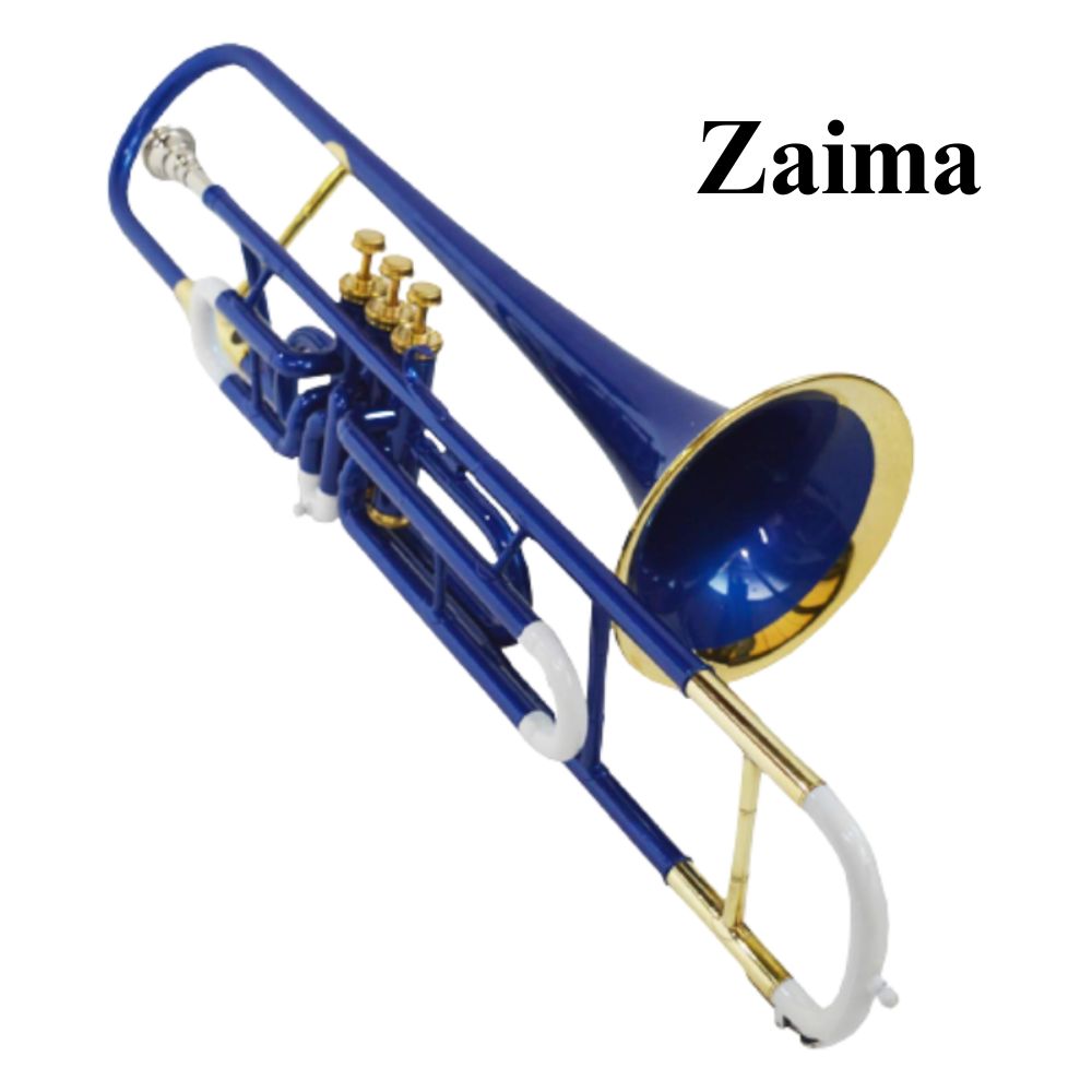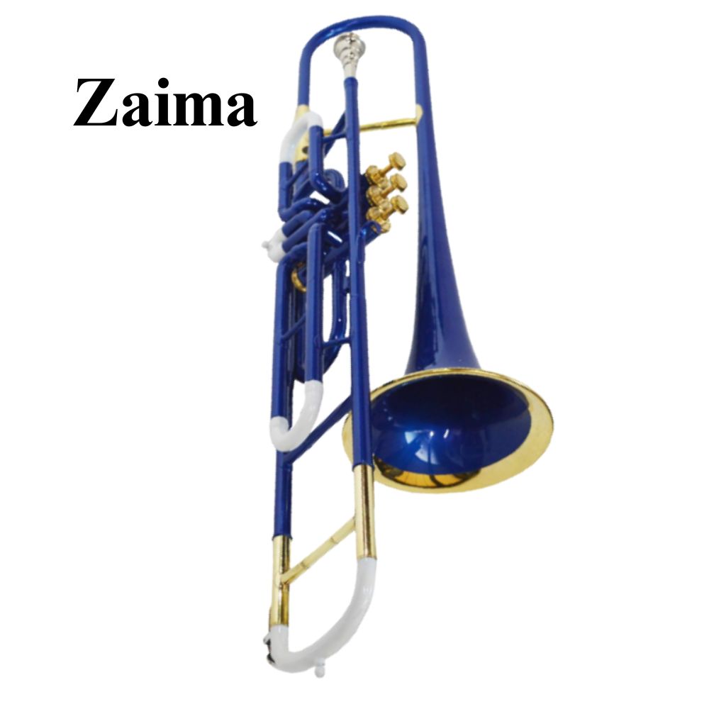 The Zaima Brass Valve Trombone in Blue/White Lacquered with Brass Finish is a high-quality, handcrafted instrument designed for students, professional musicians, and marching or orchestral performers. Made from premium brass and finished with a vibrant Blue/White Lacquer combined with polished brass, this trombone offers both durability and stunning visual appeal. Measuring approximately 82 cm in length with a horn width of 17 cm, it delivers a rich, resonant tone with excellent projection and precise intonation, making it ideal for practice, concerts, and marching bands.