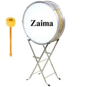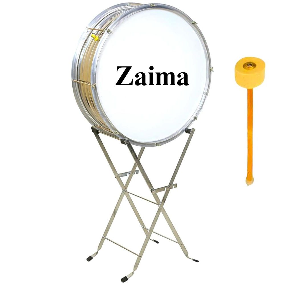 The Zaima Heavy Bass Drum is a premium-quality marching instrument designed to deliver powerful sound and unmatched durability. Available in 22-inch, 24-inch, 26-inch, and 28-inch sizes, this bass drum is crafted from high-grade stainless steel with a wide shell for enhanced sound resonance and projection. Its T-type rims and screw tension system ensure precise tuning and long-lasting performance, making it ideal for school bands, army bands, and marching parades. The elegant silver finish adds a professional and striking appearance during performances. Proudly manufactured by Al Yumna Overseas Pvt. Ltd., the Zaima Bass Drum embodies quality, strength, and reliability trusted by musicians worldwide.